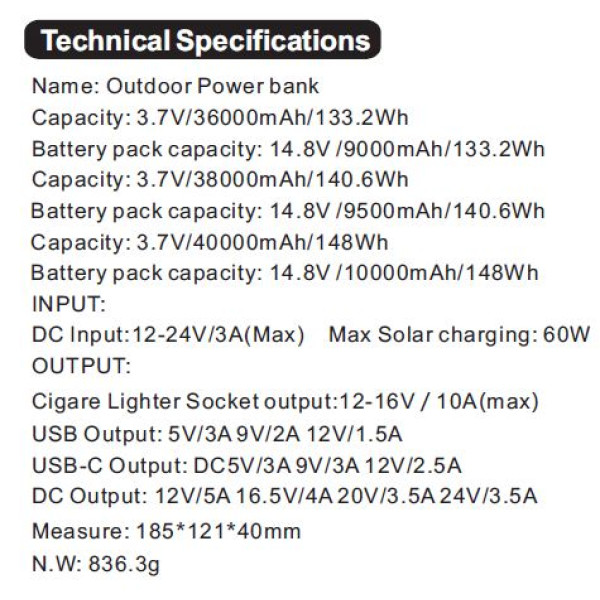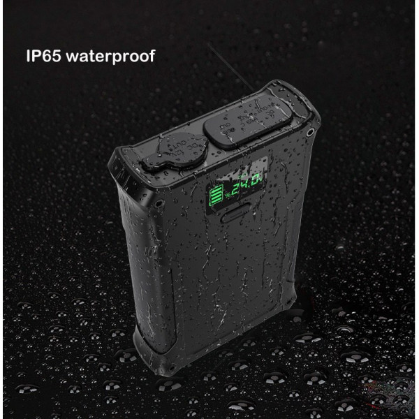 Універсальний павербанк для живлення широкого спектру гаджетів та техніки, з захистом від вологи. Може бути у нагоді в умовах зовнішнього використання. Одночасна зарядка та живлення гаджетів. Має функцію вибору напруги живлення виходу DC (12-16.5-20-24В). Має індикатор стану заряду. Заряджається від штатного мережевого адаптера, від сонячної панелі, від мережі автомобіля.