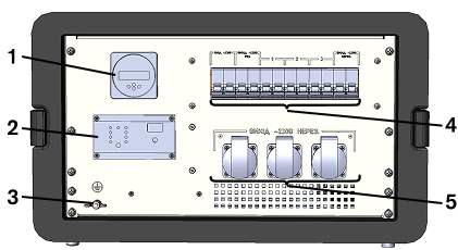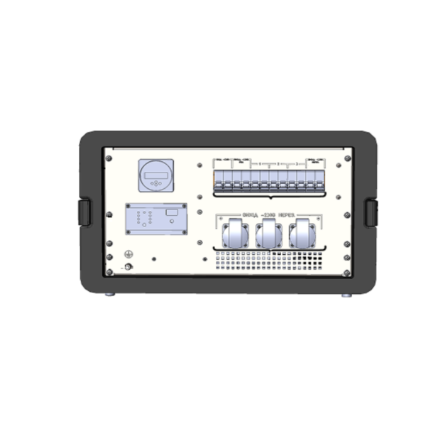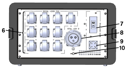 1) монітор акумуляторної батареї; 2) панель контролю інвертора; 3) підключення кабелю заземлення з комплекту кабелів модулю електроживлення (зовнішніх), підключається до колів заземлення; 4) панель вимикачів автоматичних силових; 5) нерезервовані акумуляторною батареєю розетки живлення; 6) резервовані акумуляторною батареєю розетки живлення; 7) вимикач автоматичний силовий для акумуляторної батареї; 8) роз’єм для підключення живлення від генератора або промислової мережі, використовуються кабелі з комплекту кабелів модулю електроживлення (зовнішніх); 9) роз’єм для підключення акумуляторної батареї, використовуються кабелі з комплекту кабелів модулю електроживлення (зовнішніх); 10) підключення кабелів заземлення від модулів КАЗ-МВ.