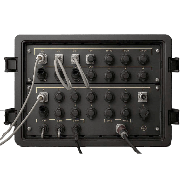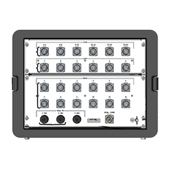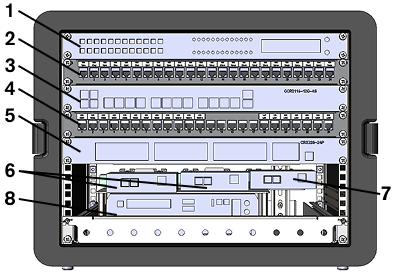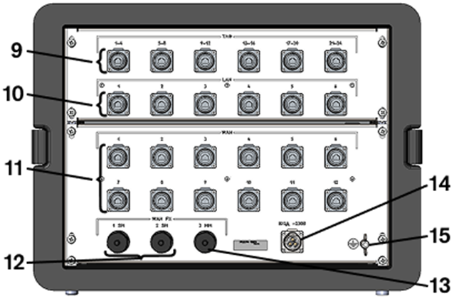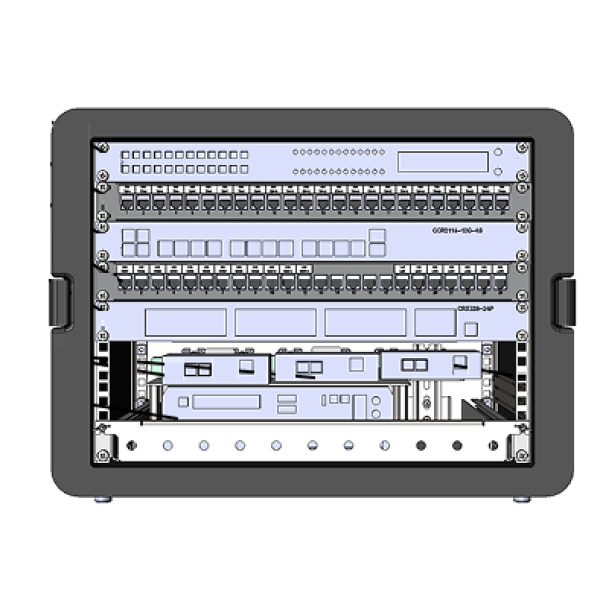 1) VoIP-шлюз Grandstream GXW4224; 2) комутаційна панель VoIP; 3) маршрутизатор Mikrotik CCR2116-12G-4S+ з SFP модулями; 4) комутаційна панель Ethernet; 5) комутатор мережевий Mikrotik CRS328-24P-4S+RM; 6) медіаконвертери Planet IFT-802TS15; 7) медіаконвертер Planet IFT-802T; 8) сервер Vecow ECS-9600-PEG-64; 9) роз’єми Ethernet для підключення телефонів через ВЩ 45/2, зкомутовано на комутаційну панель VoIP; 10) роз’єми Ethernet LAN, зкомутовано на комутаційну панель Ethernet; 11) роз’єми Ethernet WAN, зкомутовано на комутаційну панель Ethernet; 12) оптичні роз’єми LC для підключення одномодових кабелів, зкомутовано на медіаконвертери Planet IFT-802TS15; 13) оптичний роз’єм LC для підключення многомодового кабелю, зкомутовано на медіаконвертер Planet IFT-802T; 14) роз’єм для підключення кабелю електроживлення з комплекту кабелів модулю ядра (зовнішніх), може підключатись до модуля електроживлення або промислової мережі 220В; 15) підключення кабелю заземлення з комплекту кабелів модулю ядра (зовнішніх), може підключатись до модуля електроживлення або до заземлення промислової мережі