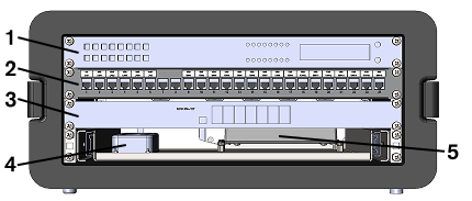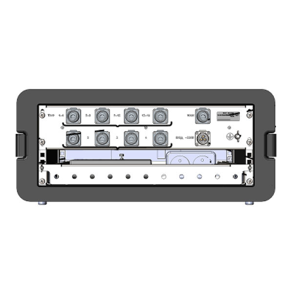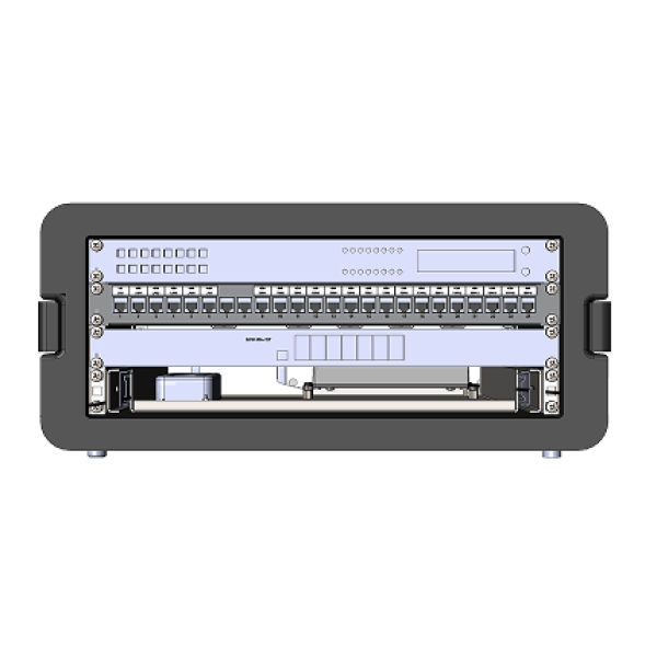 1) VoIP-шлюз Grandstream GXW4216; 2) комутаційна панель Ethernet; 3) комутатор EDGE-CORE ECS4100-12T; 4) блок розеток для живлення пристроїв, встановлених в комунікаційний бокс; 5) апаратура КЗІ "Канал-101 ДЕ (місце для її встановлення)"; 6) роз’єми Ethernet для підключення телефонів через ВЩ 45/2, зкомутовано на комутаційну панель; 7) роз’єми Ethernet LAN, зкомутовано на комутаційну панель; 8) роз’єм Ethernet WAN, зкомутовано з апаратура КЗІ “Канал‑101ДЕ”; 9) підключення кабелю заземлення (може підключатись до модуля електроживлення або до заземлення промислової мережі); 10) роз’єм для підключення кабелю електроживлення з комплекту кабелів модулю “ДСК” (зовнішніх), може підключатись до модуля електроживлення або промислової мережі 220В; 11) прохідні розетки для підключення подовжувача або іншого обладнання модуля захищеного зв’язку “ДСК”.