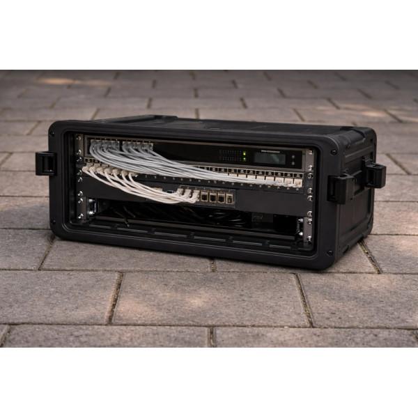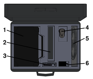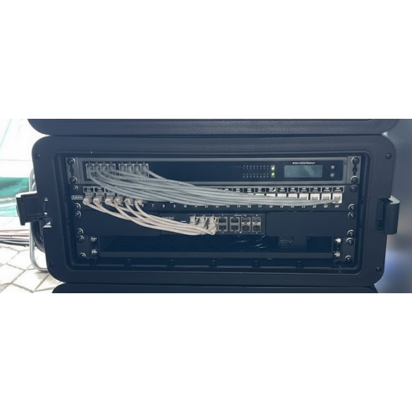 1) ноутбук Dell Pro Rugged RB14250, під ним знаходиться оптичний привід та блок живлення ноутбука; 2) мережевий фільтр; 3) маршрутизатор Mikrotik RB750Gr3; 4) комп'ютерна миша; 5) комплект патч-кордів Ethernet; 6) блок живлення маршрутизатора Mikrotik RB750Gr3.